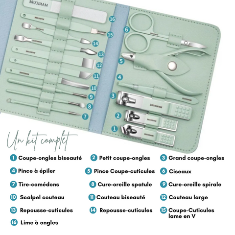 Grâce à notre kit manicure pédicure c'est possible ! Idéale tout l'année, que vous soyez à la maison et même pour partir en voyage, cette trousse, composée de 16 pièces, recèle d'innombrables trésors pour prendre soin de vos ongles avec précision.